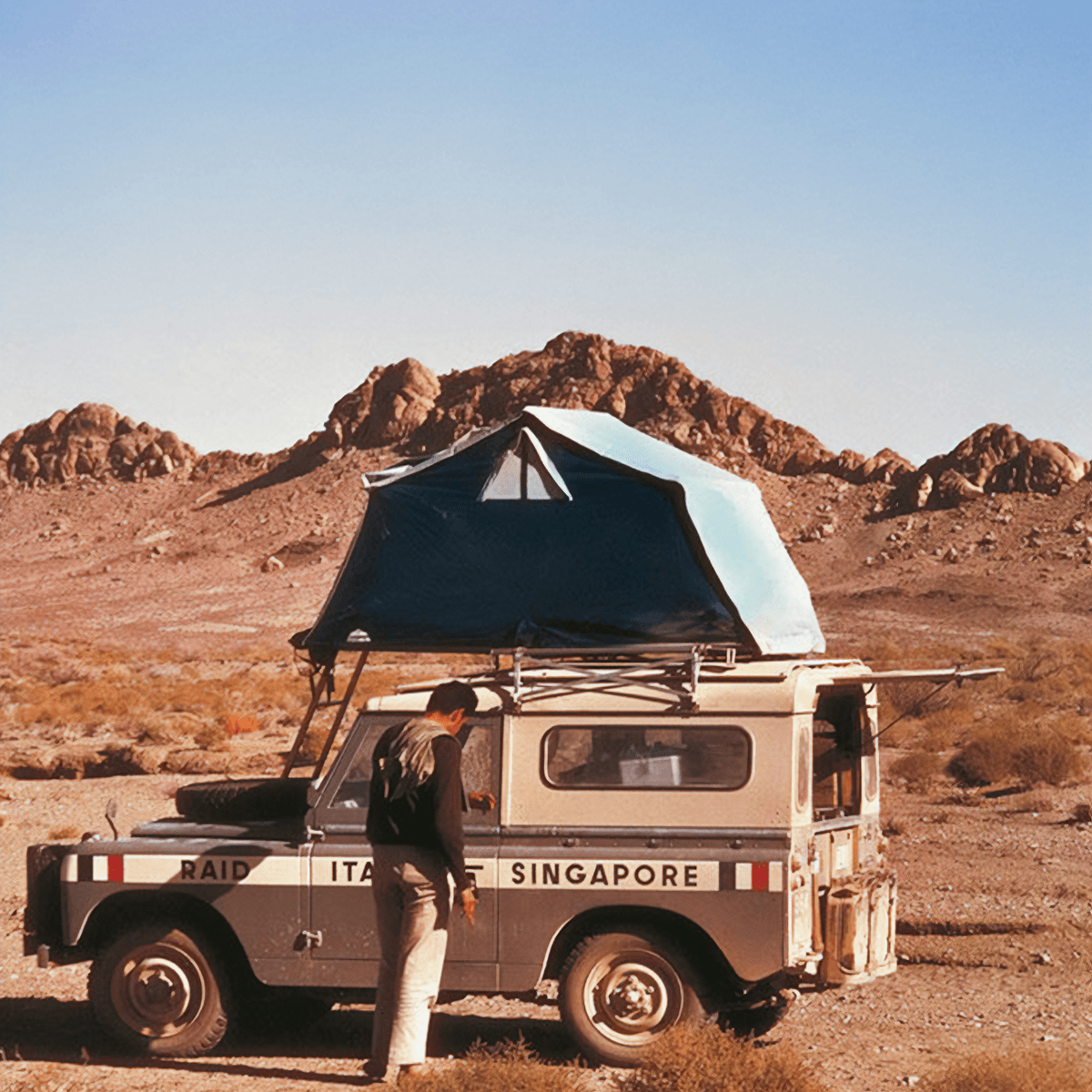 Air-Camping-Dachzelt auf dem Landrover Aziza 1 von Nino Cirani bei der Rallye Raid Mailand – Singapur 1962.