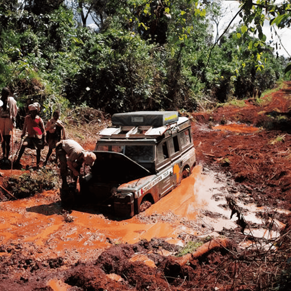 Aziza 2 imSchlamm im Dschungel von Gimma in Äthiopien. Schlamm ist der schlimmste Feind von Autofahrern